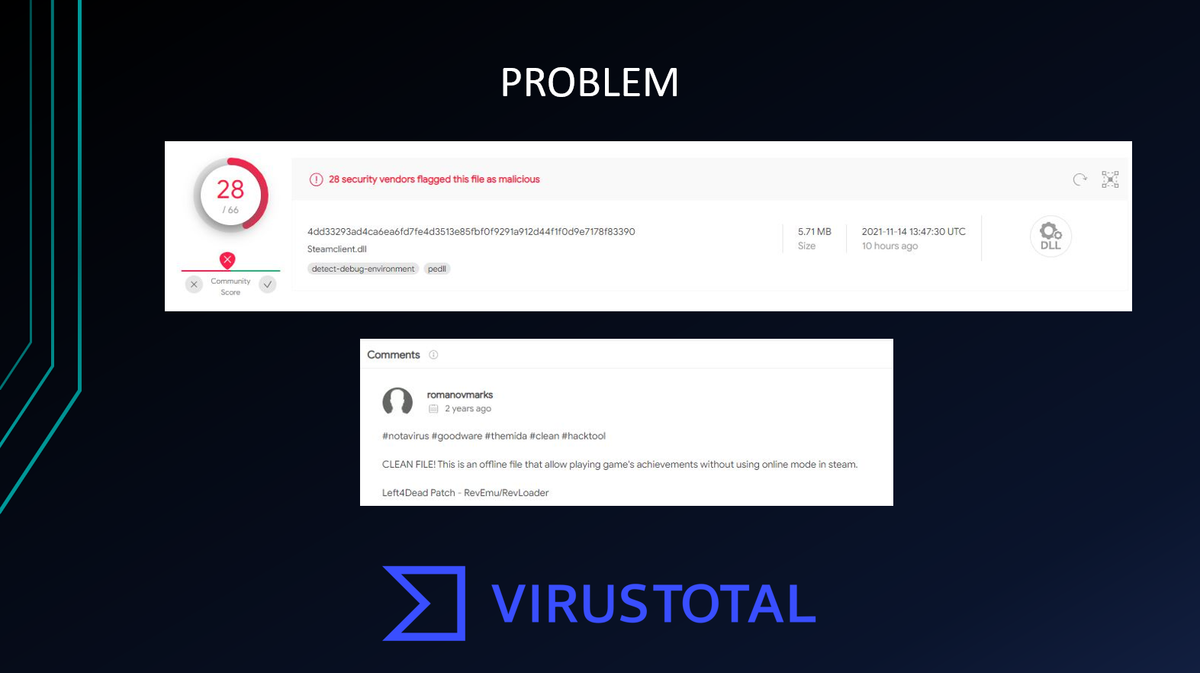 Here’s an example of the problem: a file is falsely flagged as malware by 28 different vendors on VirusTotal. In response, a user decides to warn others about the false positive by posting in the platform’s community section.