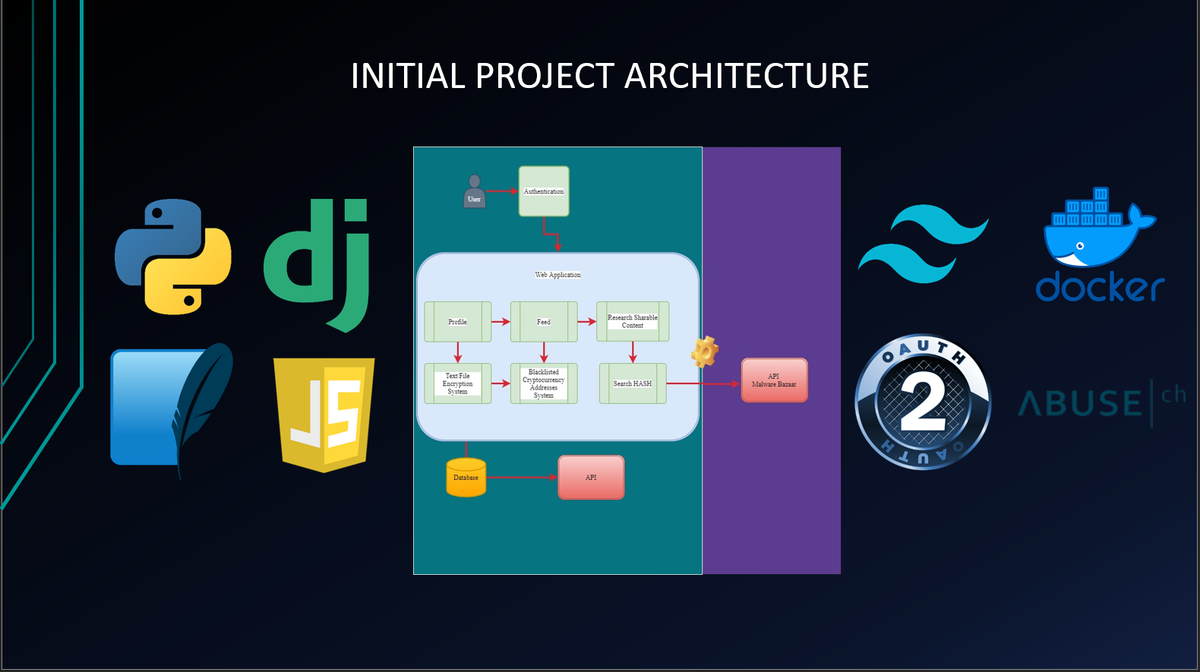 The system allows users to authenticate using their Google or GitHub accounts via OAuth2. The database stores information about user profiles and their content. It also integrates the MalwareBazaar API to retrieve information about malware samples.