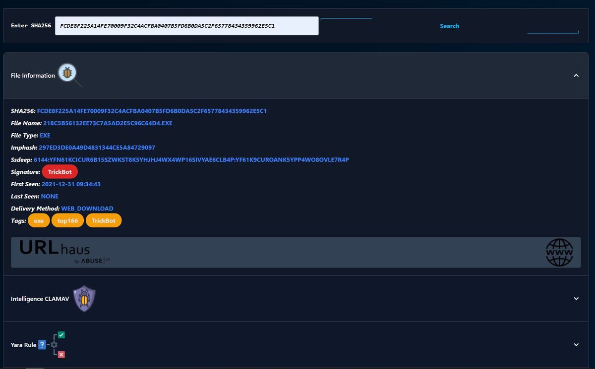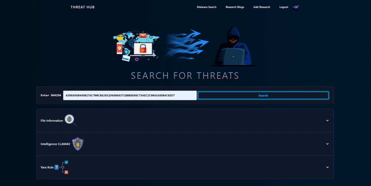 Additionally, the platform includes a malware search feature that gathers open-source information based on a user-provided SHA256 hash. This functionality is made possible through the integration of the MalwareBazaar API.