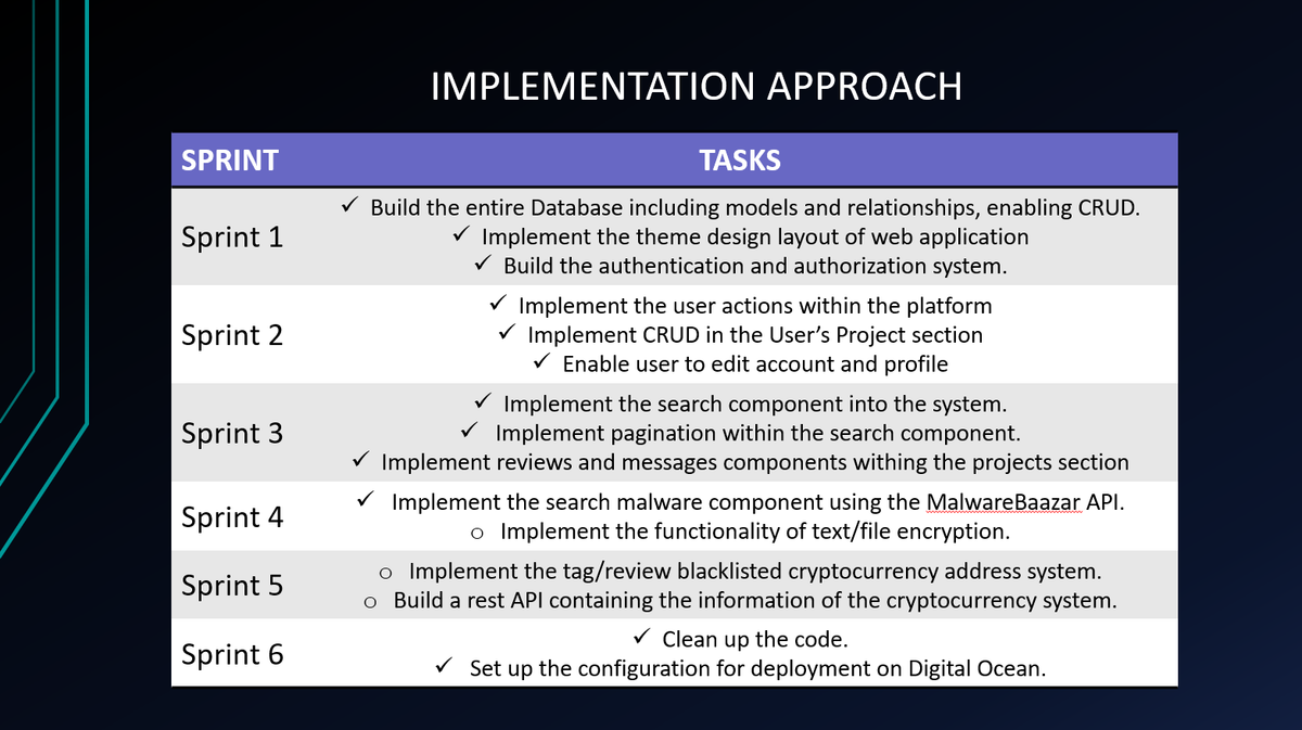 The implementation methodology for the project followed a structured approach, with a plan consisting of six sprints, each lasting two weeks. During the research phase, functional and non-functional requirements were outlined and allocated to the respective sprints to ensure a clear and organized development process.