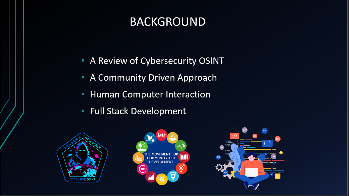 The project background focused on four main aspects, with the primary one being Cybersecurity OSINT. In this section, we conducted in-depth research on the methods and tools related to OSINT. This was followed by a Community-Driven Approach, where we explored the structure and impact of building a community-driven project. We also delved into the principles of Human-Computer Interaction (HCI) to ensure usability and accessibility. Finally, we researched full-stack development, covering the technologies and practices required to build a complete and functional system.